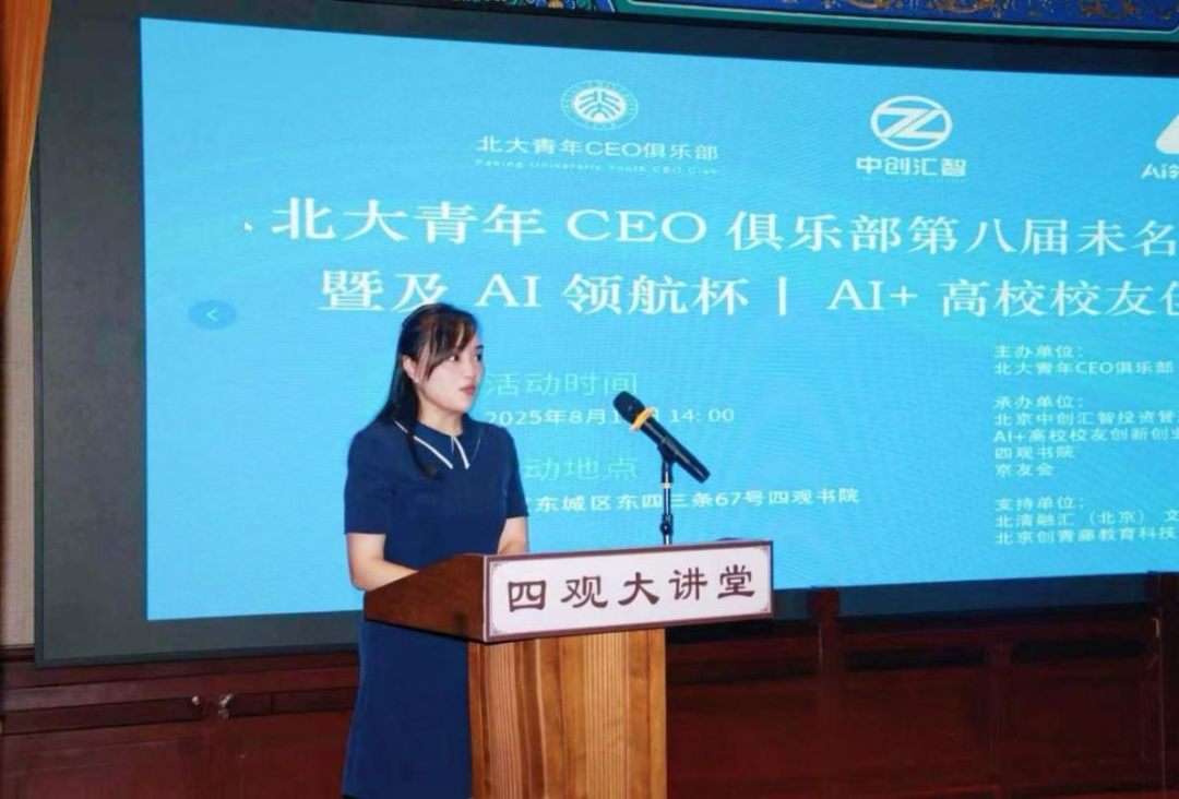 活动伊始,北大青年CEO俱乐部未名创投家负责人、“AI领航杯”全国校友AI创新创业大赛高校校友专委会副秘书长麻喜君致开幕辞。她强调了在AI时代背景下,“资本赋能实体”的紧迫性与新内涵,并对各协办、支持单位的支持表示诚挚的感谢。