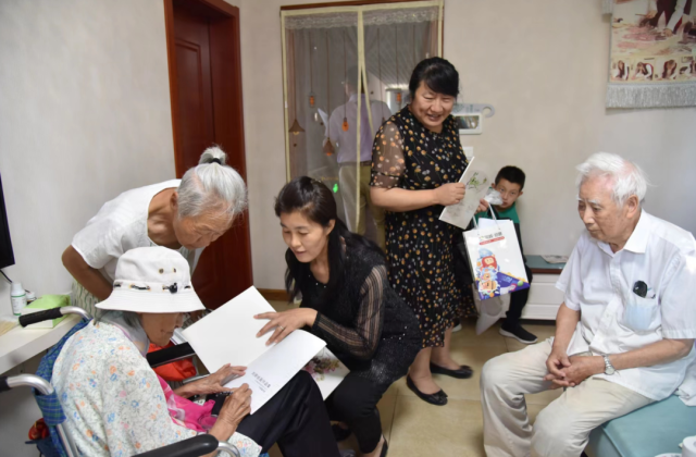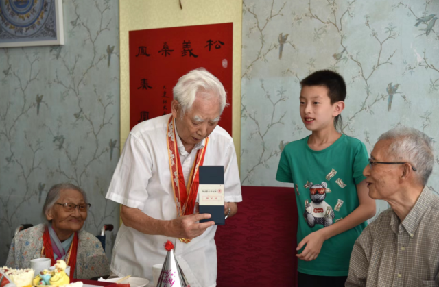 北大校友子女、华夏学校的王玺凯同学向寿星爷爷赠送学校特制的书签“读书做圣贤,立志报家国”,表达敬仰之情,表示将以爷爷为楷模,勤奋学习,立志报国。