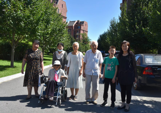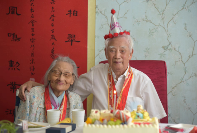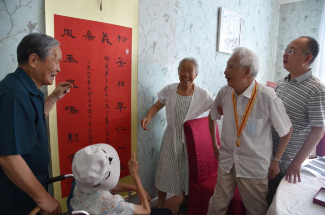 一同来看望张老的还有96岁高龄的陈庆道学长。陈学长1946-1949年在北大化学系学习,他曾组建北大理学院合唱团,团结进步力量,参加反内战、反迫害学生运动,迎接北平和平解放,毕业后来到大连,一直于化物所工作,退休前任大连化物所副所长。陈老和张老在沙滩红楼读书时曾住在同一个宿舍,陈老还是张老的入党介绍人。在祝贺张老百岁寿辰时,陈老还带来了自己撰写的寿联“玄鹤千年寿,青松万古春”。