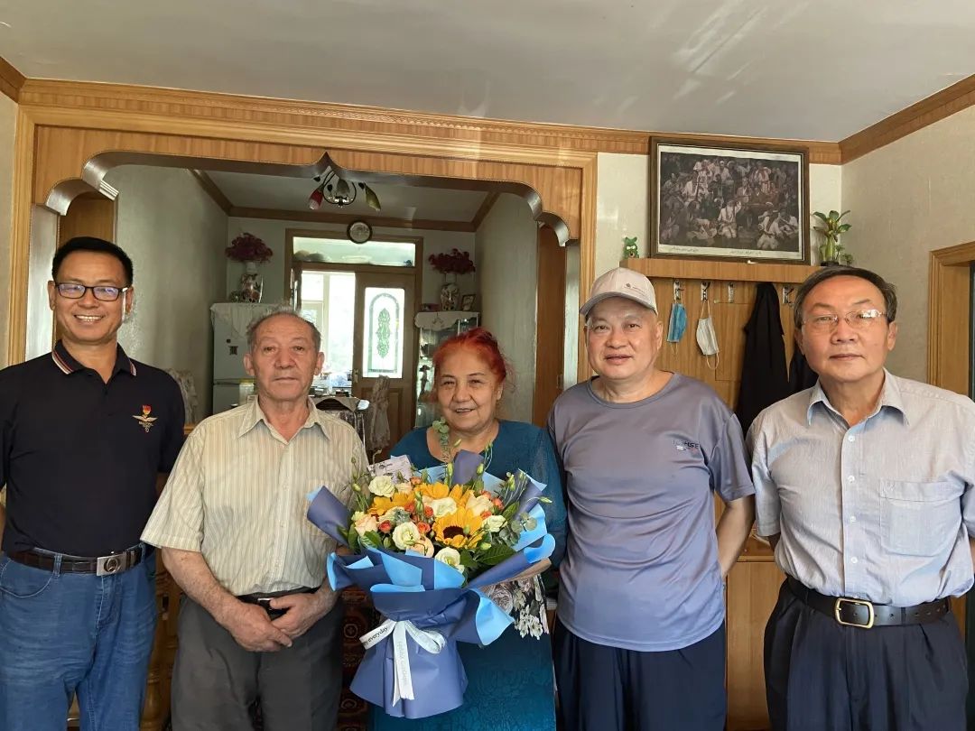 2022年7月5日,在古尔邦节来临之际,新疆维吾尔自治区北京大学校友会会长闫科培,副会长、党支部书记张兴华,副秘书长兼办公室主任方建平,办公室副主任王贝贝一行,代表全体在疆北大校友专程慰问塔伊尔江·穆罕默德和张学文两位老学长,向两位北大校友及家人致以问候与祝福,并赠送鲜花和慰问礼品。老中青校友亲切交流,共叙校友情谊。