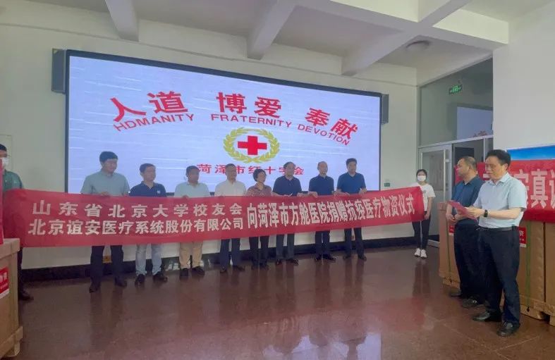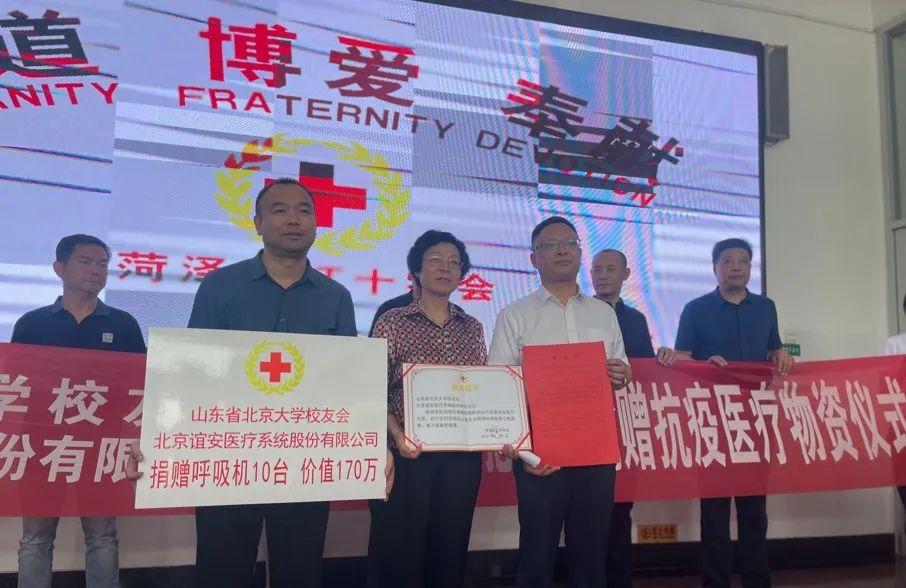 2022年6月9日下午,山东省北京大学校友会和北京谊安医疗系统股份有限公司抗疫物资捐赠仪式在菏泽市卫生健康委举行。山东省北京大学校友会副会长兼秘书长梁守兰、副会长倪胜希、常务理事张冰、校友会秘书处赵继飞等一行5人参加捐赠仪式。山东省北京大学校友会联合北京谊安医疗系统股份有限公司共同举办的抗疫物资爱心捐赠活动,为菏泽市红十字协会共捐赠北京谊安呼吸机10台,价值170万元。菏泽市政协副主席、民革主委赵胜利,菏泽市卫生健康委党组书记、主任、市中医药管理局局长、二级巡视员张善甲,北京谊安医疗系统股份有限公司全国组织发展部、山东负责人张文书等出席捐赠仪式。菏泽市卫生健康委副主任、市红十字会常务副会长张佩宪主持活动。