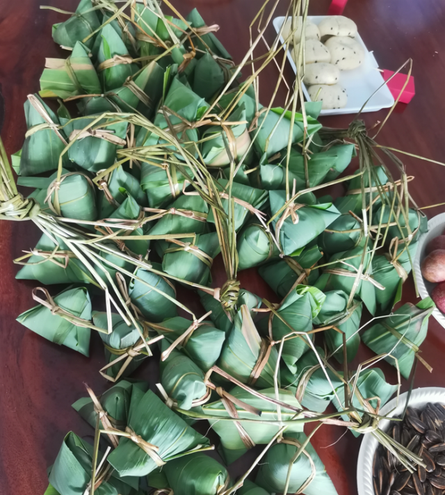 层叠叠的粽叶层叠叠的香,红通通的枣儿红通通的运,热乎乎的粽子热乎乎的情,喜庆庆的端午喜庆庆的过。包粽子高手们展现娴熟的功夫,取粽叶、填米和馅料、扎粽绳……动作一气呵成。在一双双巧手下,又美味又有颜值的粽子一一亮相。不多时,热气腾腾的粽子就端上了桌。品尝亲手DIY的粽子,别有一番乐趣在心头。
