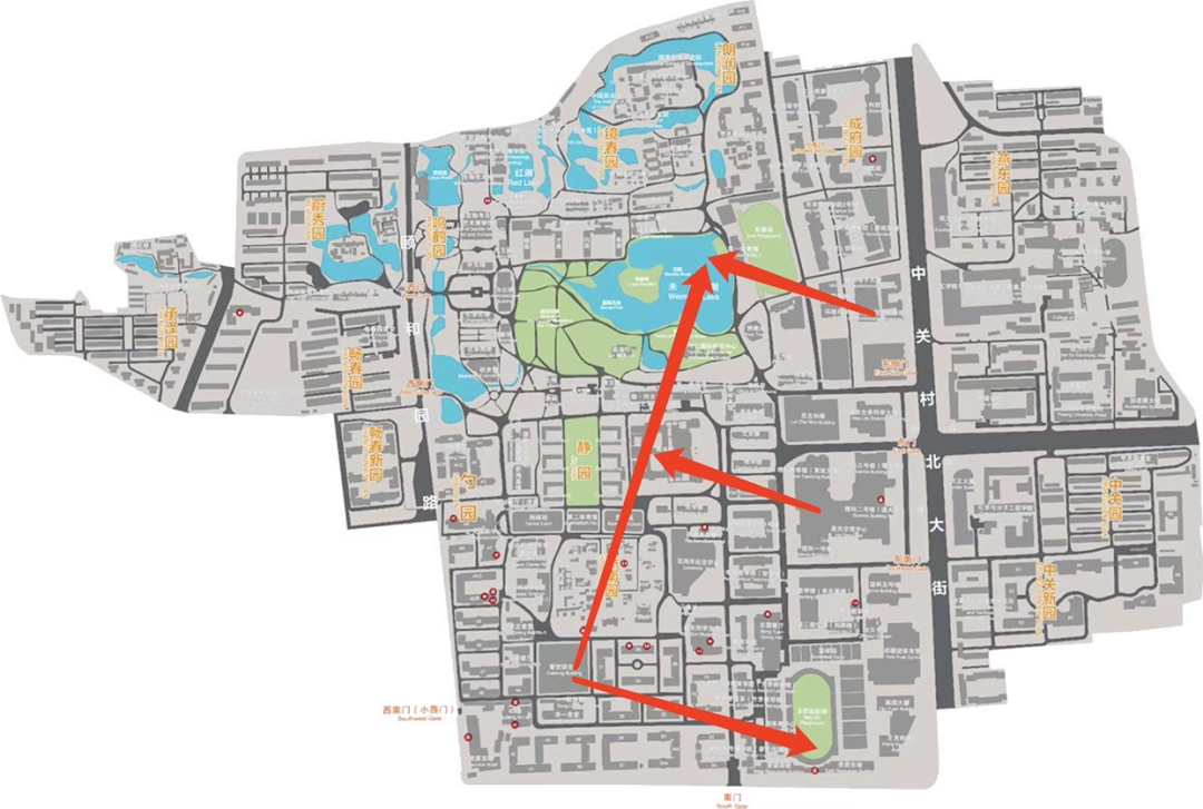 最后的环节由在读本科生2020级冀佳男和2021级杜佳琪带领校友们云游燕园。从家园食堂的熙熙攘攘、扑鼻饭香,到五四操场的青春洋溢、活力四射;从理科一号楼的严谨务实、设施齐全,到图书馆的宏伟壮观、沁人书香;从微纳电子大厦的前沿先进、科研创新,到未名湖畔博雅塔下的波光粼粼、碧树清风……在《青春大概》《燕园情》的歌声里,主持人带领大家云上游燕园,带领院友们重新踏上青葱岁月的蜿蜒小路,回望往昔熟悉的人事风光,纵览北大不变的景观和崭新的面貌。在路上,追寻青春的痕迹、怀念温馨的瞬间、重拾宝贵的回忆。不知不觉间,就用脚步描绘出了一张专属于北大信科人的大写的“E”字。