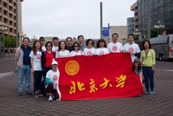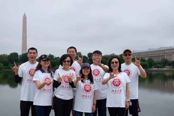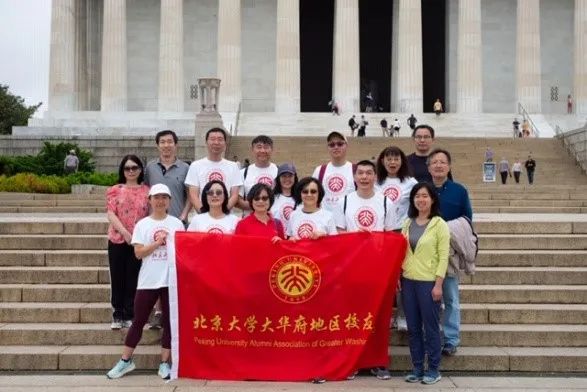 校友们穿上大华府地区校友会统一定制的T恤衫,组成一支精神奕奕的小队,簇拥着鲜红的校旗合影留念。