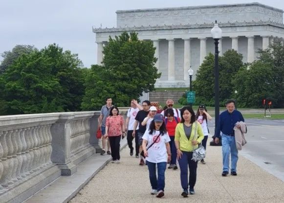 不到8点,大华府地区校友会会长丁卫及其先生张志军(1985级信息管理和计算机系校友) ,1986级地质系校友王佩忠与刘小薇夫妇,1986级化学系校友田丰及夫人方芳等组织者,就已抵达华盛顿城中心的儿童广场(L’enfant Plaza)集合点。大家纷纷热情地寒暄、拥抱,唤醒了清晨的广场。