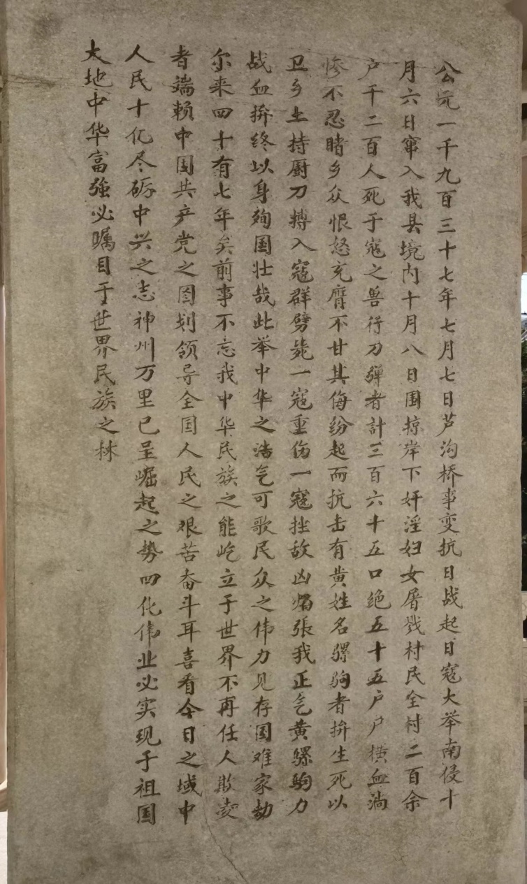 1984年5月,正定县委、县政府在岸下村设立“岸下惨案死难同胞纪念碑”,时年31岁的青年干部、正定县委书记习近平同志亲自审定了纪念碑碑文:“…中华之浩气可歌,民众之伟力见存,国难家劫尔来四十有七年矣,前事不忘我中华民族之能屹立于世界不再任人欺凌者,端赖中国共产党之图划领导,全国人民之艰苦奋斗耳,喜看今日之域中,人民十亿尽砺中兴之志,神州万里已呈崛起之势,四化伟业必实现于祖国大地,中华富强,必瞩目于世界民族之林。”