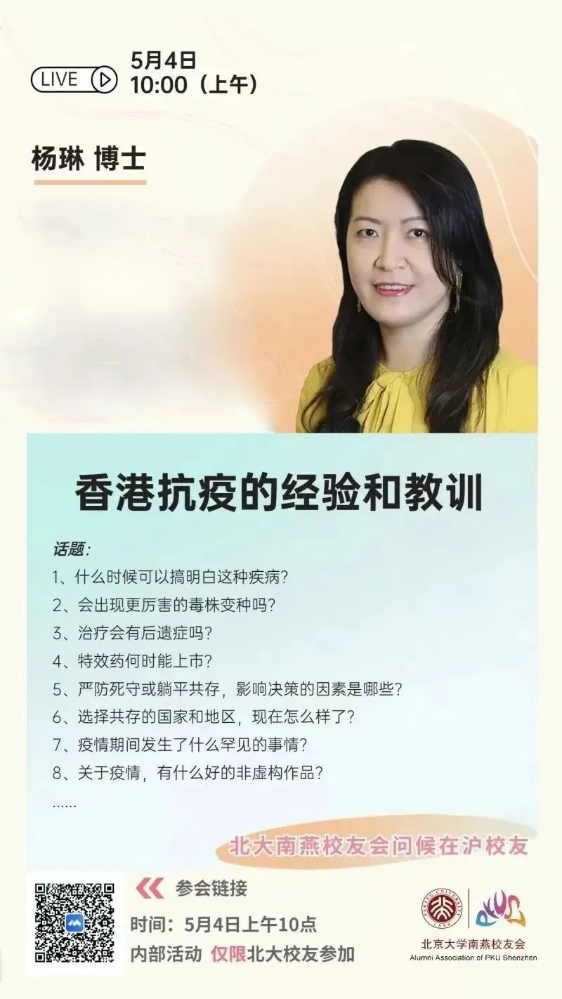 出于对因疫情而长期封控在家的在沪校友的关心,北京大学深圳研究生院校友会向所有在沪校友发送了《致北京大学深圳研究生院在沪校友的一封信》,在为在沪校友梳理心理咨询渠道的同时,校友办调研搜集了在沪校友的相关需求。应校友们的需求,同时作为124周年校庆的系列活动之一,5月4日上午,校友会组织了一场名为“香港抗疫的经验和教训”的在线讲座。