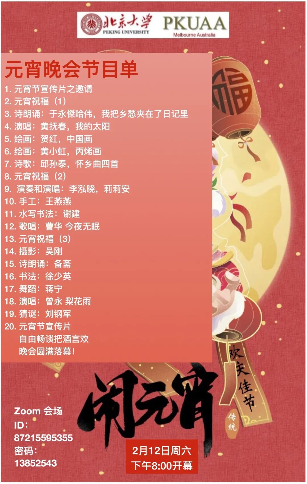 2月12日,北京大学墨尔本校友会(以下简称:墨尔本校友会)举办2022年虎年线上元宵晚会。近四十位新老校友和家属齐聚“云端”,喜气洋洋闹元宵。
