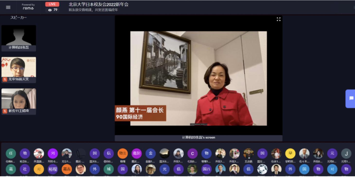 现任会长颜燕代表理事会致辞。她说道,校友们的年级专业各不相同,但对燕园的美好回忆和在日生活的共同经历让大家有缘相聚,共庆新春。颜燕会长代表理事会向校友和嘉宾们拜年,并邀请所有参会者云端举杯,迎接虎年。