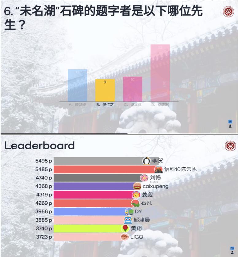 适逢元宵将至,本次新年会设置了两个特别的“猜灯谜”环节——“燕园知识”“中日知识”有奖竞答。理事会希望借此环节,校友们能一起回忆珍贵的燕园时光,分享在日奋斗的共同经历。竞答环节由王曙球校友主持,通过在线平台实时进行积分排名赛。校友们参赛热情高涨,两个环节均有60余人参加,积分排名更是你追我赶。最终薛芳、陈云帆等几位校友凭借超群实力名列前茅,喜获迎春大礼。