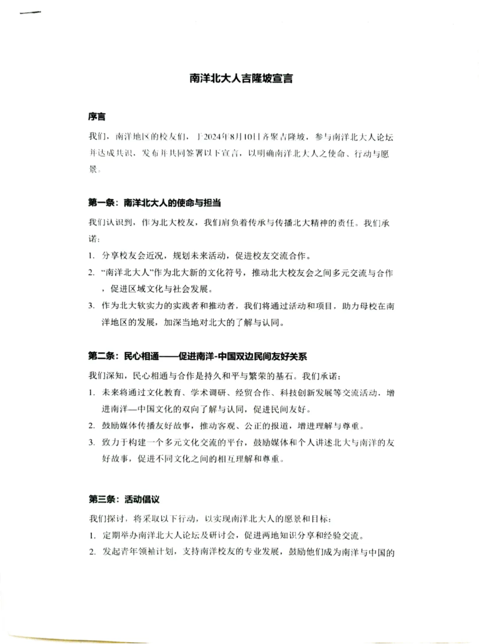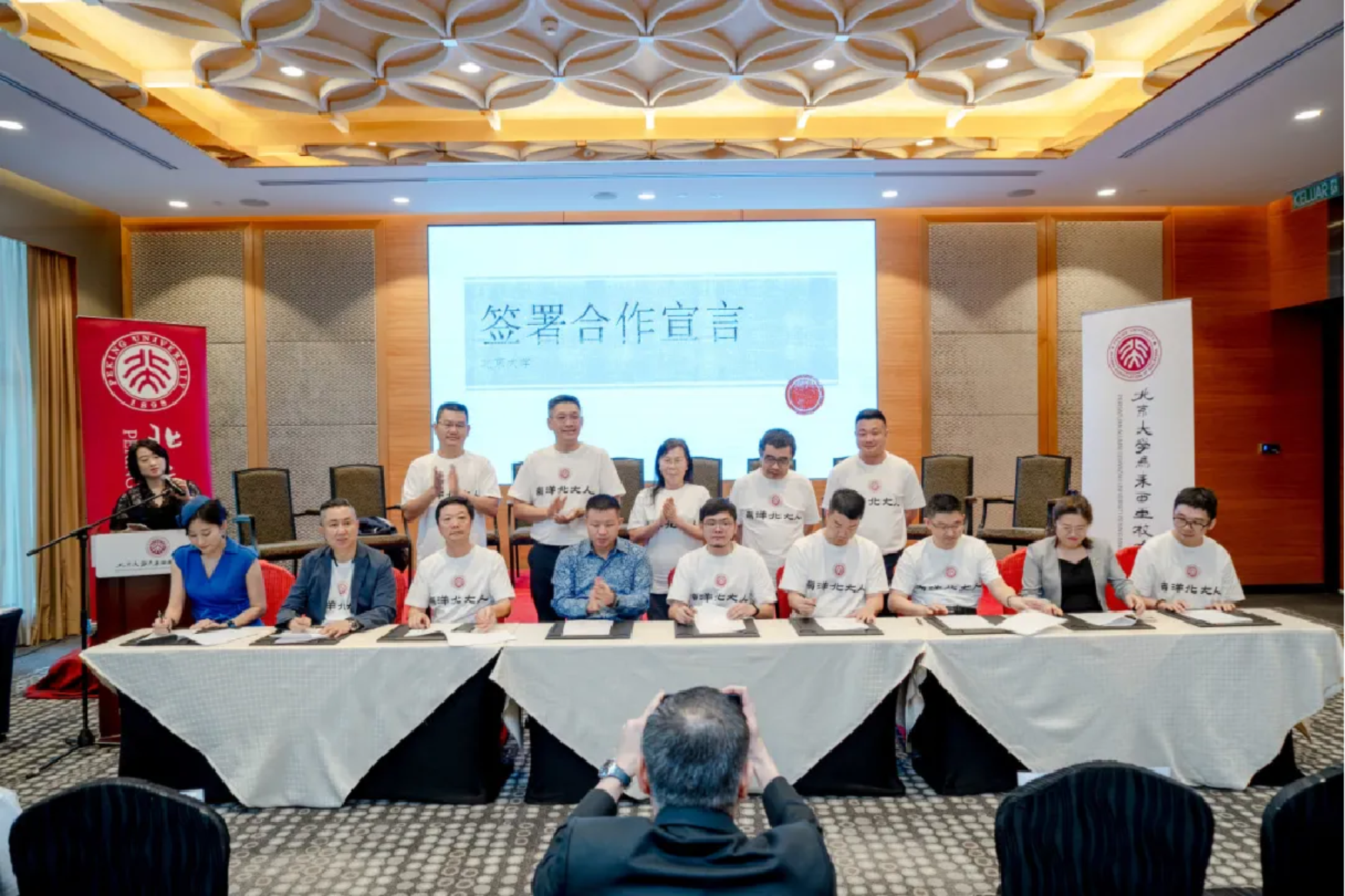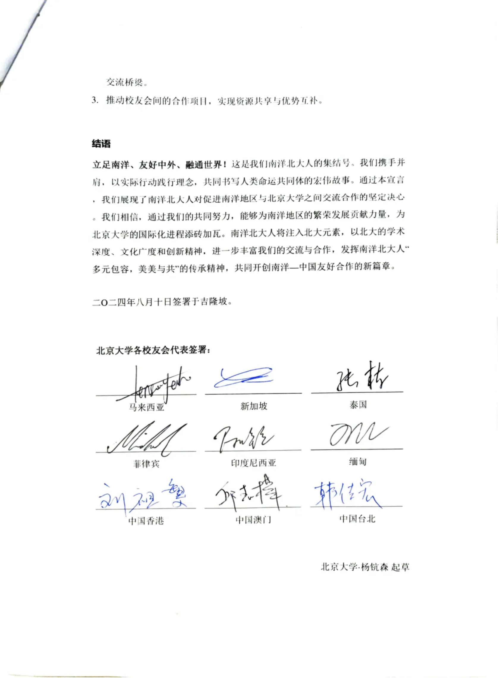 在讲者发言与自由交流环节结束之后,各地代表共同签署了《南洋北大人吉隆坡宣言》。宣言指出,作为北大精神的传承者,南洋北大人将致力于推动校友会之间的多元交流与合作,促进区域文化与社会发展。校友们承诺通过分享经验、规划未来活动,以及推动一系列实践项目,深化南洋地区对北大的了解与认同,助力母校在南洋地区的发展。宣言还强调了南洋北大人在促进南洋与中国民间友好关系中的重要作用。通过文化教育、学术研究、经贸合作和科技创新等交流活动,南洋北大人将进一步增进两地文化的双向理解与认同,推动媒体客观公正地传播友好故事,构建多元文化交流的平台。宣言呼吁定期举办南洋北大人论坛及研讨会,发起青年领袖计划,并推动校友会之间的合作,以实现资源共享与优势互补,共同书写南洋—中国友好合作的新篇章。