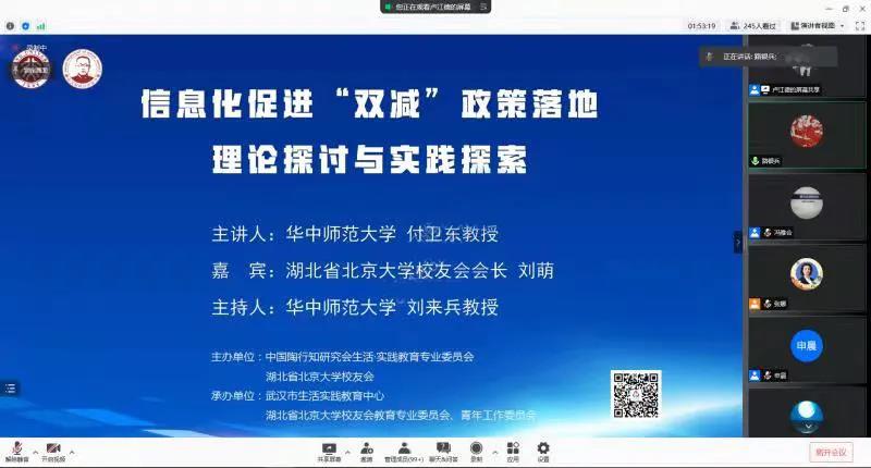 2022年1月7日,湖北省北京大学校友会(以下简称“湖北校友会”)联合中国陶行知研究会生活·实践教育专委会,共同在线上举办了第十四期教育沙龙,邀请华中师范大学信息化与基础教育均衡发展协同创新中心付卫东教授作《信息化促进“双减”政策落地理论探讨与实践探索》主题演讲。
