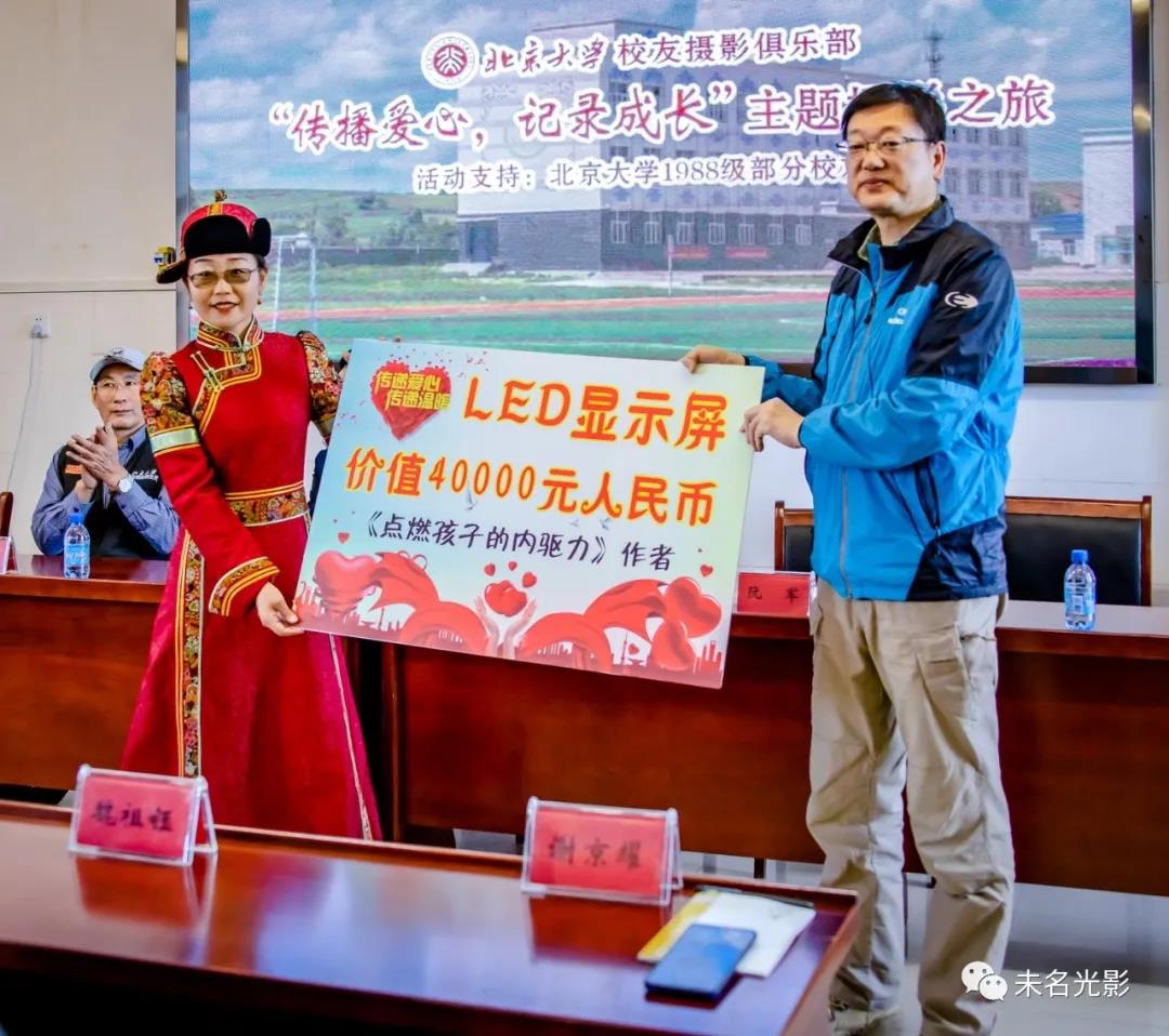 下午,镇里和学校举行了一个高清电子屏捐赠仪式,阮军代表捐赠的部分88级校友在捐赠仪式上发言,达来诺日镇镇长其力格尔对北大校友的捐赠和摄影俱乐部的“传播爱心,记录成长”主题摄影之旅内蒙古行活动表示感谢和欢迎,他还鼓励小学生,一定要学好英语,学好汉语,学好蒙古语,为自己开辟更广阔的人生之路。