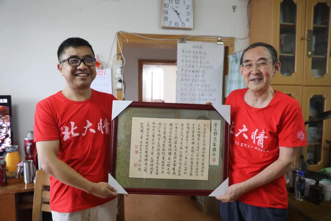 李文胜副会长与63级数力系的校友们互赠《北大情》书法作品,远在南京的63级的校友冯一丁与老师们视频连线,互诉思念之情。