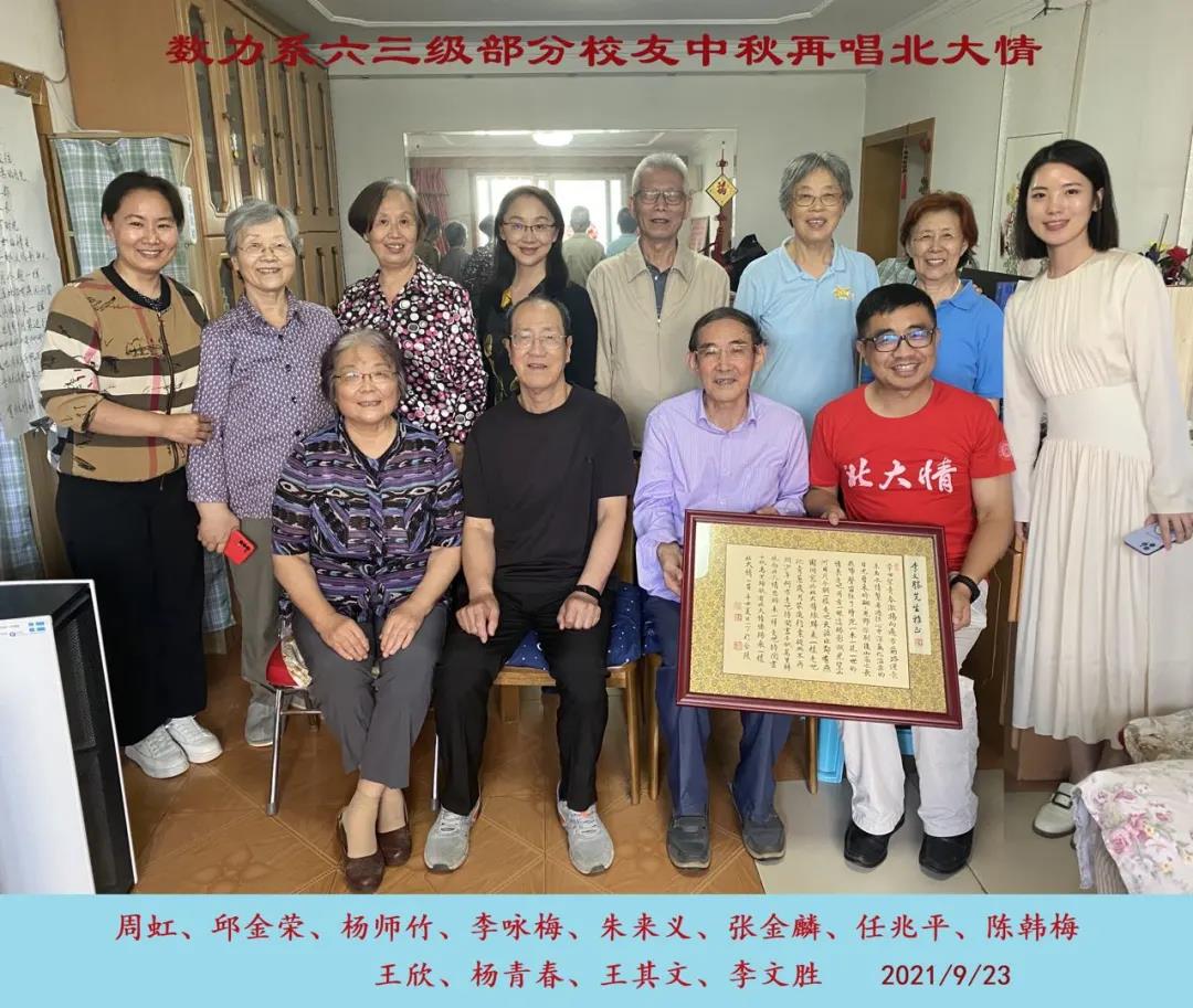 2021年9月23日,数力系63级校友王欣、杨青春、王其文、朱来义、杨师竹、任兆平、张金麟与北京大学校友工作办公室主任、北京大学校友会副会长兼秘书长李文胜、北京大学工学院助理院长、校友与基金管理办公室主任、北京大学工学院院友会执行副会长兼秘书长李咏梅及北京大学校友工作办公室陈韩梅、北京大学工学院校友与基金管理办公室周虹在校友王其文老师家中共庆中秋、十一双节。
