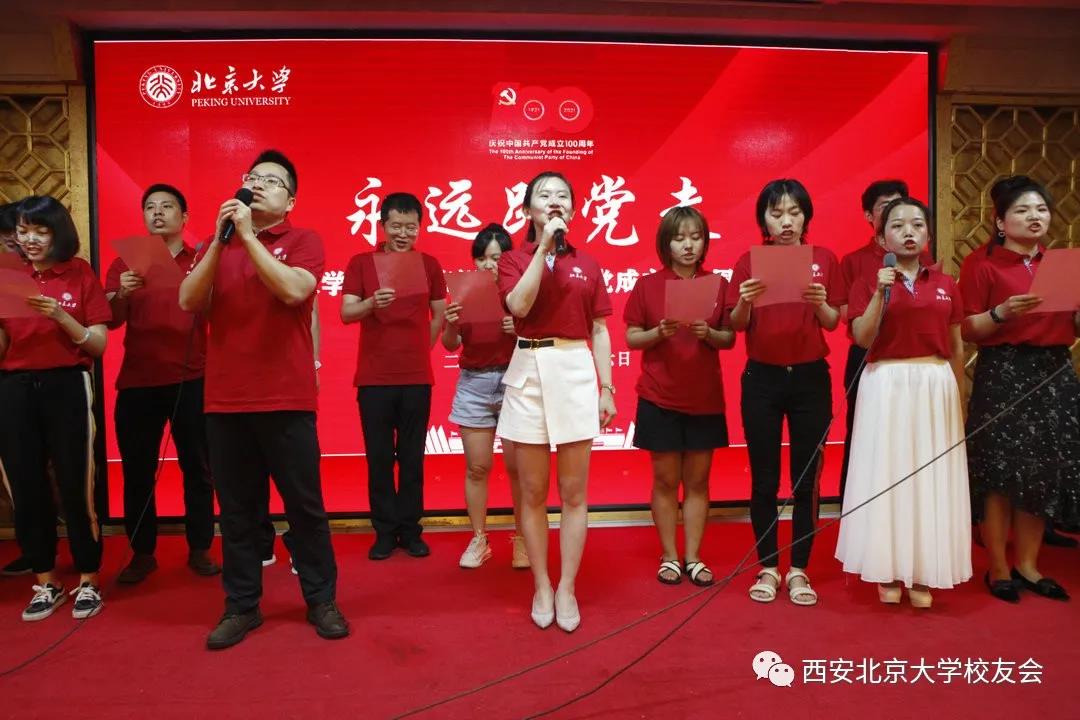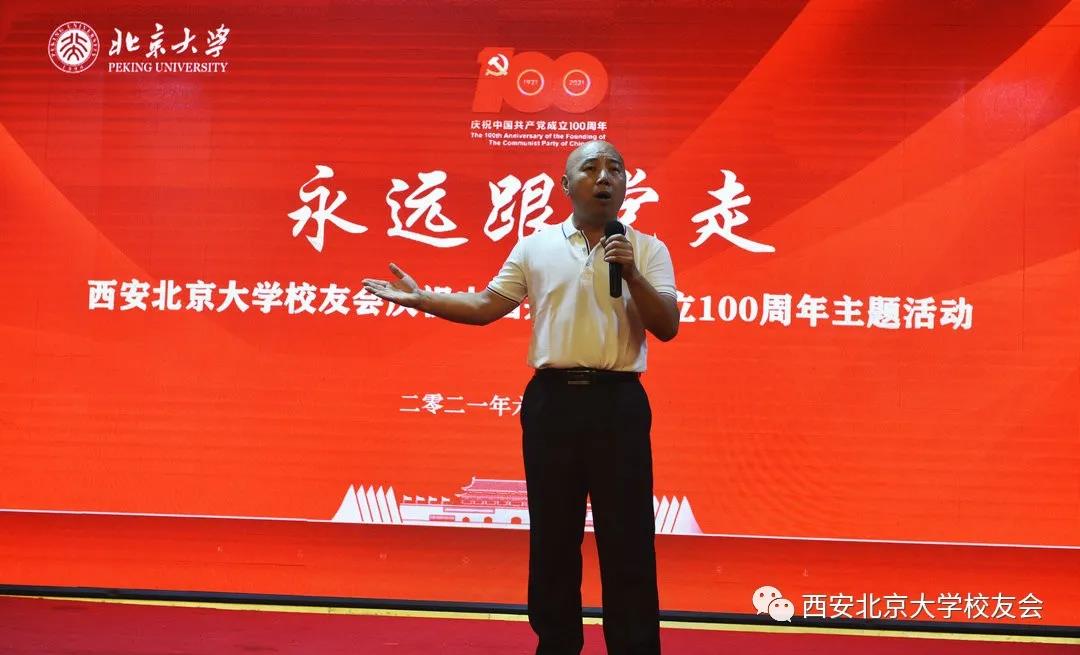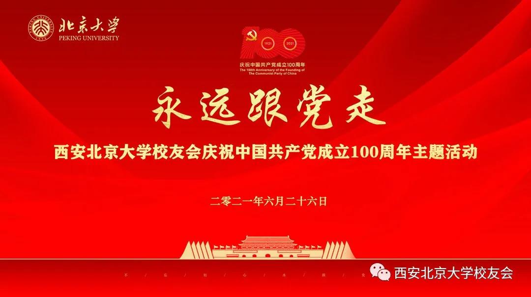 在习近平主席于6月25日下午带领中央政治局同志来到北大红楼参观“光辉伟业红色序章——北大红楼与中国共产党早期北京革命活动主题展”,重温李大钊、陈独秀等开展革命活动、推动马克思主义在中国早期传播、酝酿和筹建中国共产党等革命历史并给与高度评价的第二天,即2021年6月26日下午,西安北京大学校友会的校友们满怀激动与喜悦的心情欢聚一堂,为庆祝中国共产党成立100周年隆重举办“永远跟党走”主题活动。