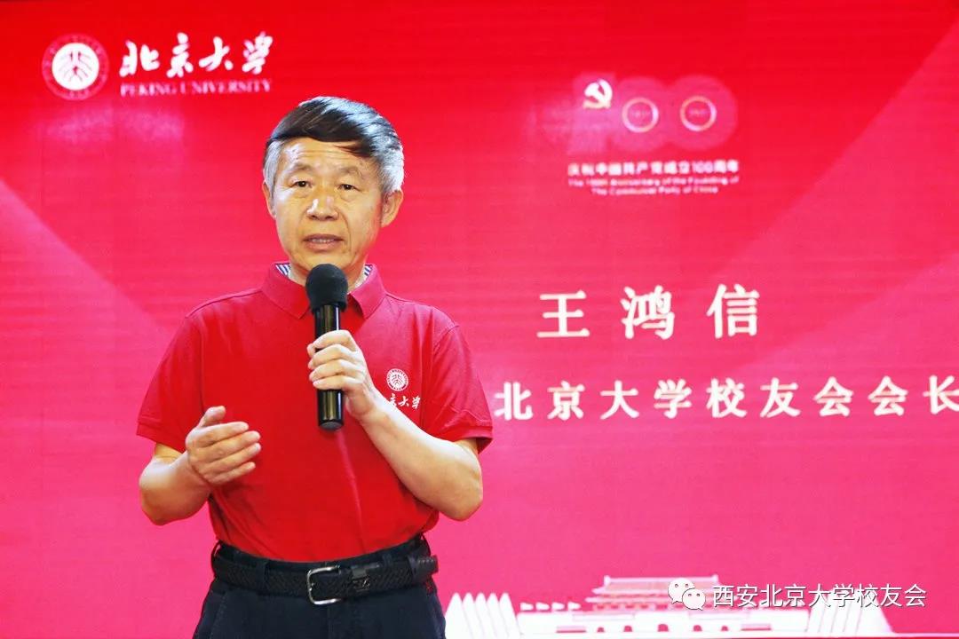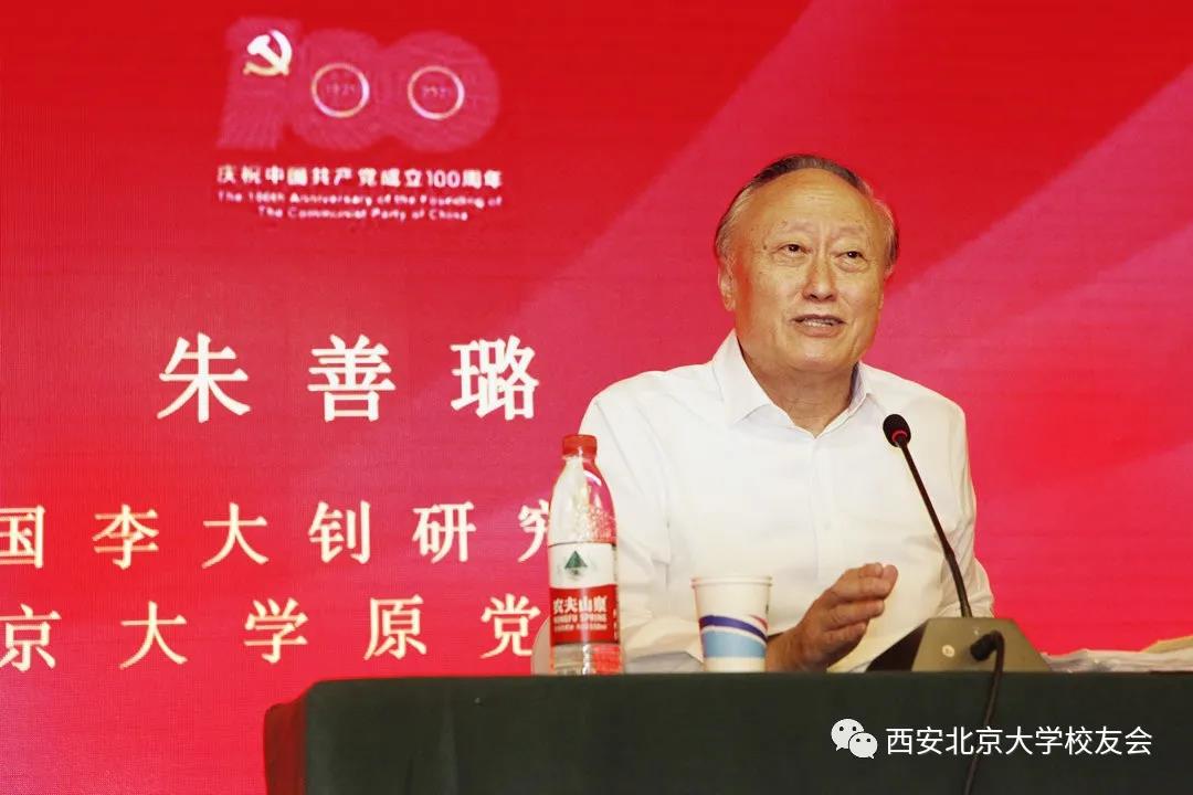 北京大学原党委书记、中国李大钊研究会会长朱善璐应邀作主题演讲,西安北京大学校友会名誉会长赵世超及会长王鸿信分别讲话,上半场活动由常务副会长兼秘书长杨彬主持。陕西省总工会副主席兰新哲校友、西安市人民政府办公厅主任王建东校友、西安市鄠邑区委书记范九利校友、西安市人民政府原副秘书长宓维新、西安经开区原常务副主任张保中、西安交通大学教授(西迁人)马知恩校友、西安泰康医院管理有限公司董事长张云峰校友、逯博士健康管理集团董事长袁彦峰校友、校友会副会长苏联菊、李郁、副秘书长程立军、黄菁茹、艺术团团长王翊和副团长王伟等出席活动。来自各行各业的老中青校友近150人共庆党的百岁生日。