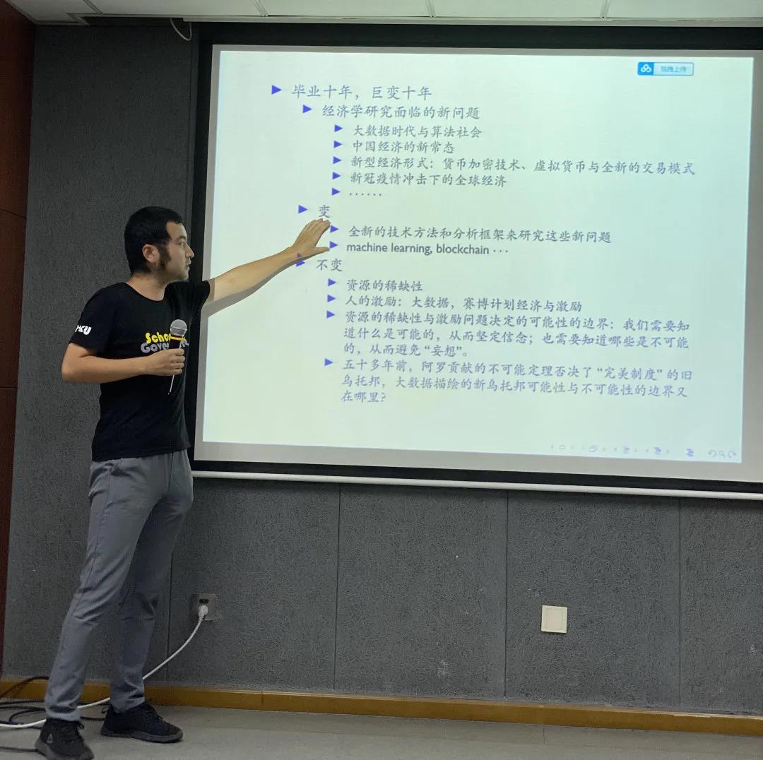 孙宇锋同学向大家分享了经济学的前沿研究议题,提出了毕业十年来经济学研究的“变”与“不变”,围绕隐私保护、社会征信系统等问题,让大家重新回归课堂,感受到宏观变动对微观现象的影响。丛聪同学做了评论,从投资实务角度印证了学界研究的前沿性和重要性。