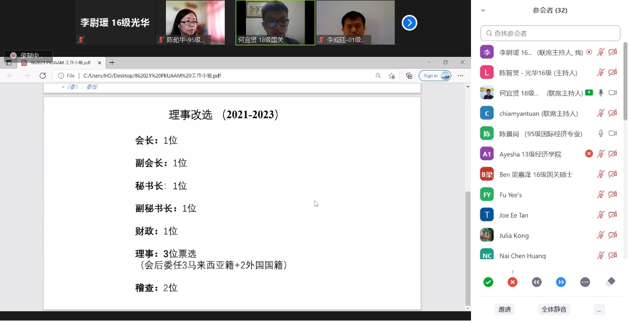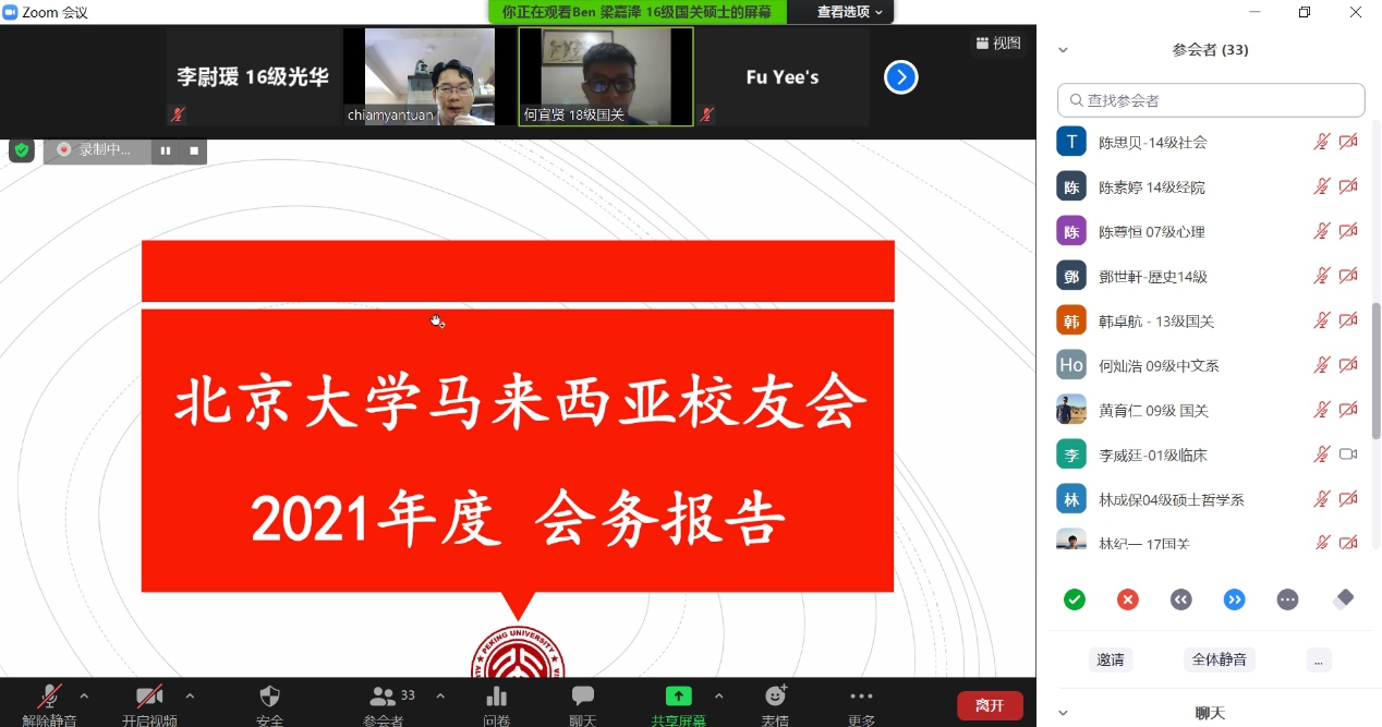 2021年6月26日(周六),北京大学马来西亚校友会举办线上年度会员大会暨理事会改选,来自全球各地30余名校友出席。