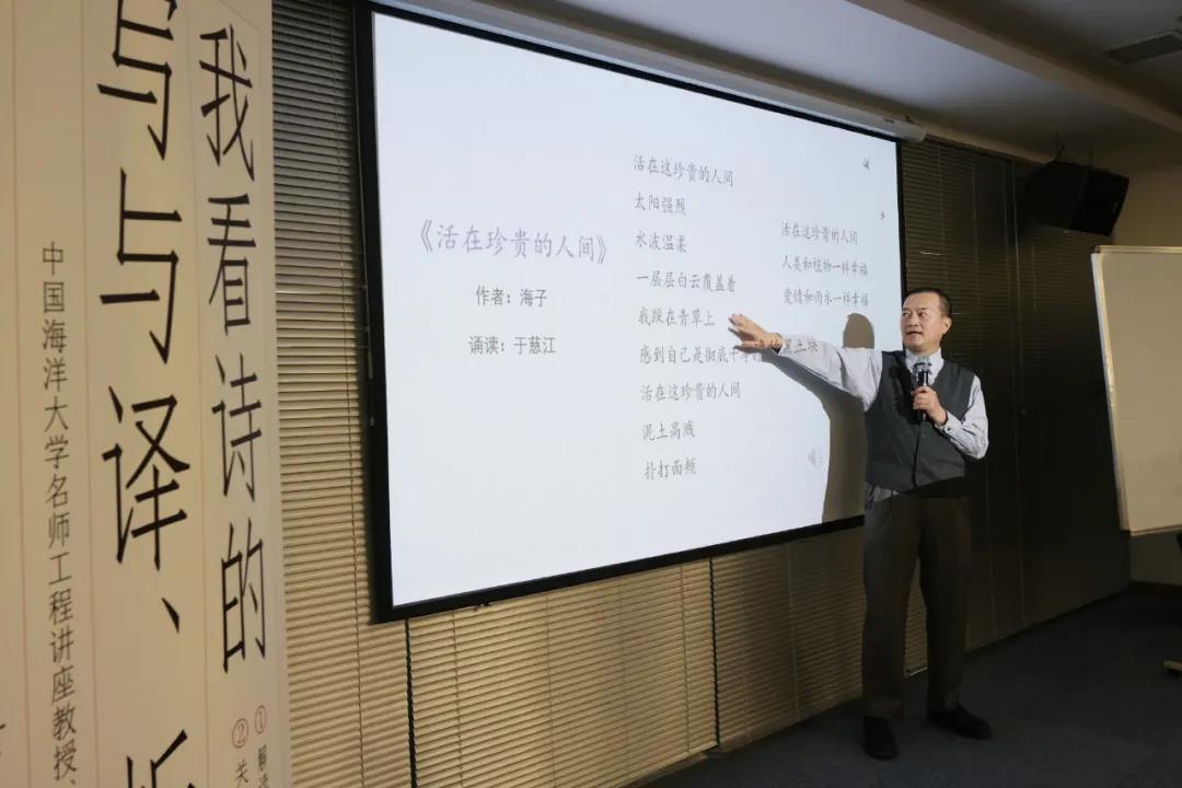 关于诗歌的诵读,他提倡“学人诵读”。所谓“学人”,就是广义的学者、研修者,就是普通的文化人,而不是专事演艺或朗诵的演员;而所谓“学人诵读”,就是要吃透文本,以文本的深度理解和贴切传达为重心,然后以清晰、平和、精准的诵读呈现文本。于教授还以具体的诗篇为例,带领大家体会如何写、怎样诵,让大家体会诗歌之美妙。同时,还邀请听众现场上台诵读海子的诗歌《活在珍贵的人间》,感受诗歌诵读的仪式感。
