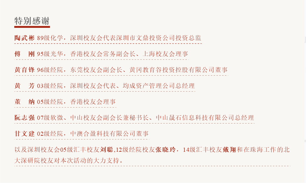 本次交流活动让大家直观深刻地感受到了珠海校友们在各自打拼的行业和领域付出的心血和取得的成绩,感受到了北大人散作满天星,在珠海大地上拼搏奋进、全面推进城市经济、金融、企业和教育等领域发展的硕果。