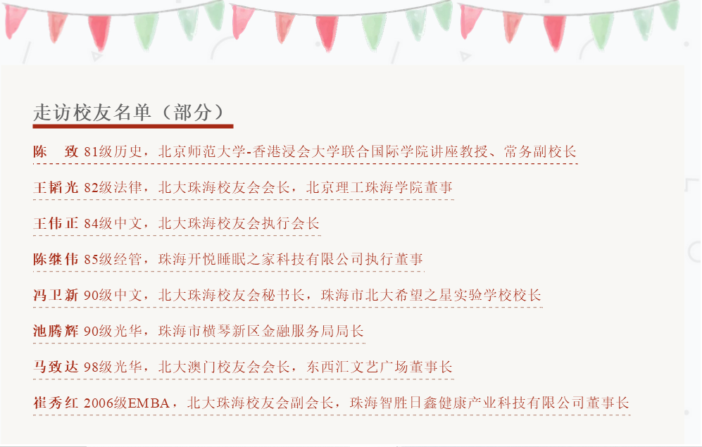珠海校友会成立于 1999 年,是粤港澳大湾区成立时间最早的校友会之一。发展至今,在珠海的北大校友遍布高校、各级政府部门、教育、文化、金融、大健康等各行各业。在本次交流活动中,校友们走访了由80级数学系校友汤涛院士担任校长的北京师范大学-香港浸会大学联合国际学院,由北大珠海校友会会长、82级法律系校友王韬光担任董事的北京理工珠海学院和由90级光华校友池腾辉担任局长的横琴新区金融服务局。