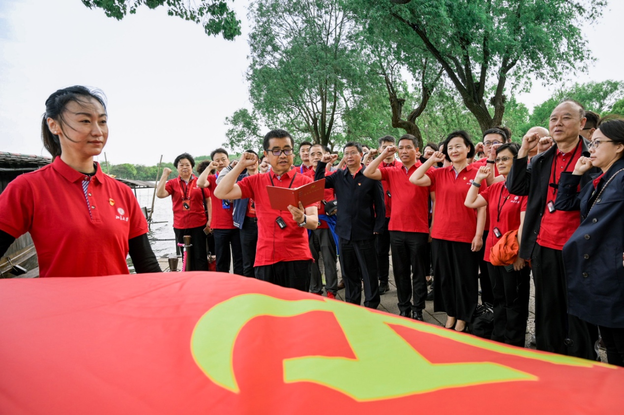 秀水泱泱,红船依旧。时代变迁,精神永恒。百年风华,红船精神昭示着永不褪色的精神丰碑。铮铮誓言表决心,李文胜带领全体党员校友站在红船前,面向鲜艳的党旗,举起右手,庄严宣誓,重温入党誓词。“我志愿加入中国共产党,拥护党的纲领,遵守党的章程……”党员们的声音交汇在一起,字字掷地有声,句句铿锵有力。