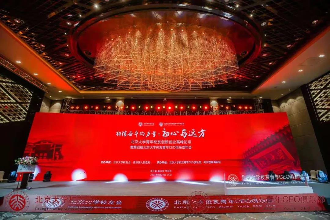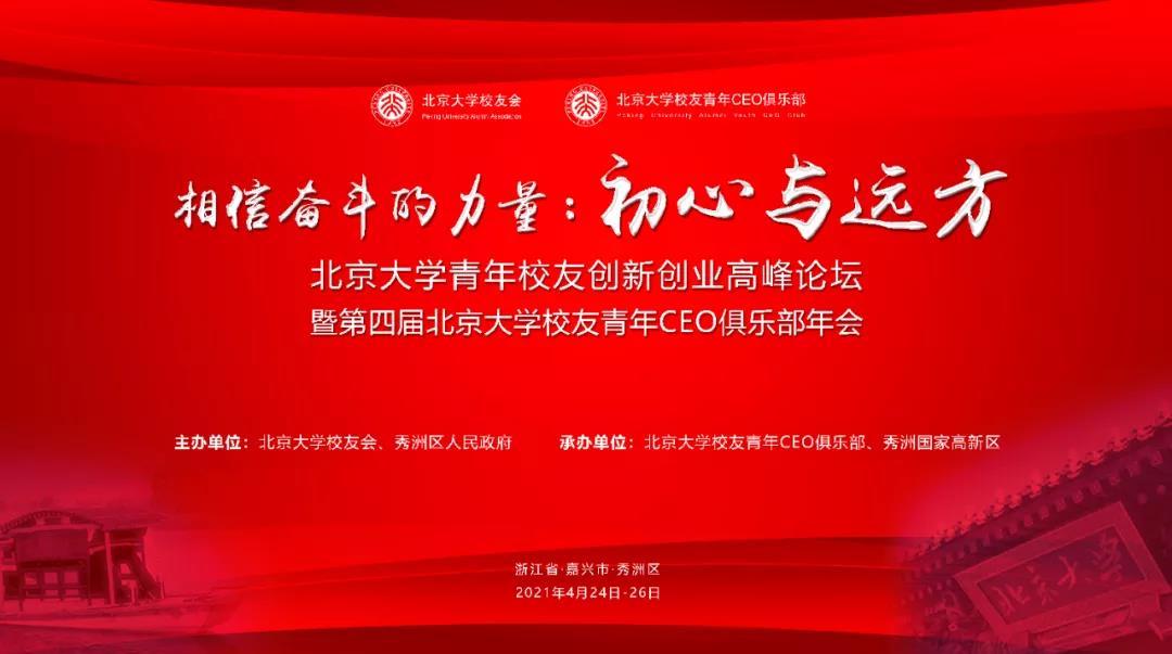 初心有光,前路莫忘。2021年4月24日至26日,北京大学青年校友创新创业高峰论坛暨第四届北京大学校友青年CEO俱乐部年会在浙江省嘉兴市秀洲区隆重举行。本届年会以“相信奋斗的力量:初心与远方”为主题,由北京大学校友会、嘉兴市秀洲区人民政府主办,北京大学青年CEO俱乐部、秀洲国家高新区承办。