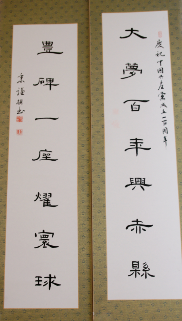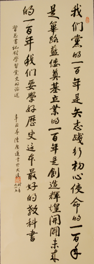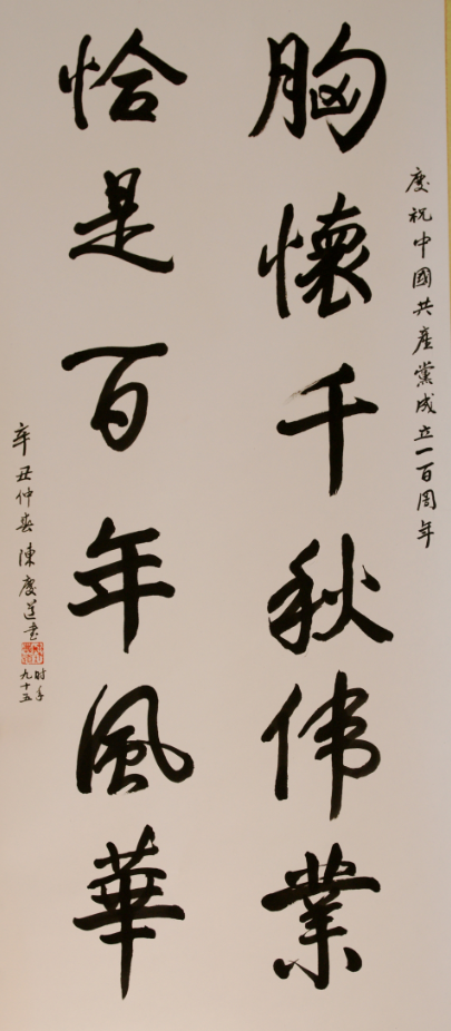 为歌颂一百年来在共产党领导下祖国建设的伟大成就,歌颂美好生活,弘扬中华民族优秀的传统文化,展示校友书画爱好者的艺术水平,大连校友会3月27日发布“建党百年校友书画展”征稿通知,不到20天就收到20多幅作品,有95岁的中科院化物所原副所长陈庆道学长书写的习总书记对学习党史的论述和对联“胸怀千秋伟业,恰是百年风华”两个条幅。