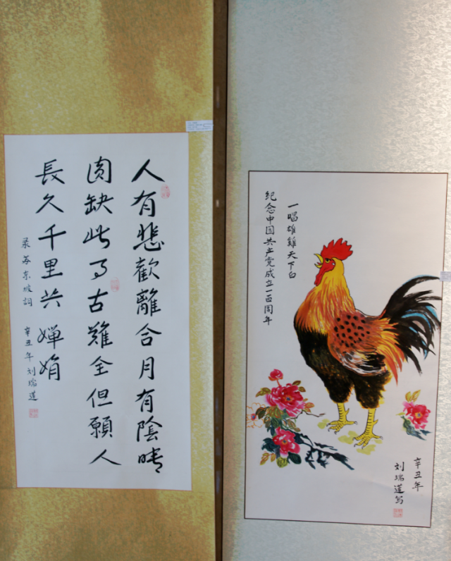 大连市合成纤维研究所退休的高级工程师、82岁的59级化学系刘瑞莲学姐画了一幅“一唱雄鸡天下白”,写了一幅行书书法作品。