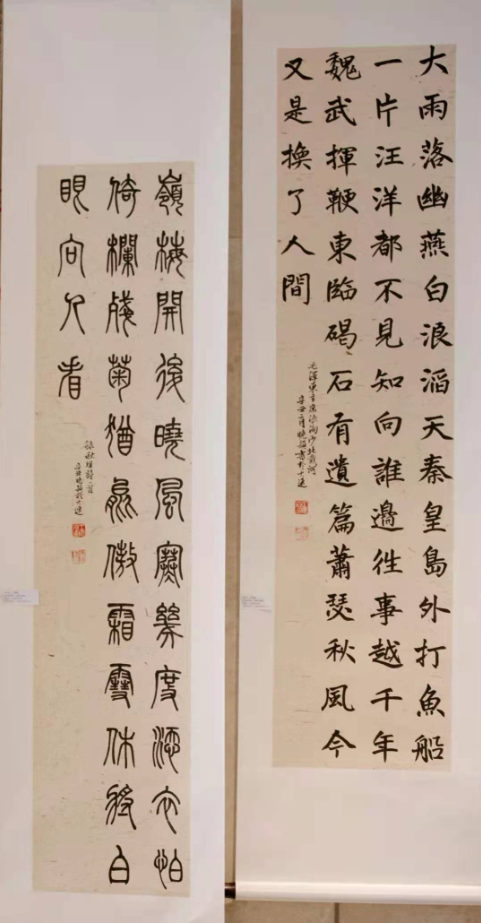大连市机关工作的97级生命科学学院的王晓颖校友用楷书写了毛主席诗词“浪淘沙北戴河”和小篆体写的秋瑾的诗。