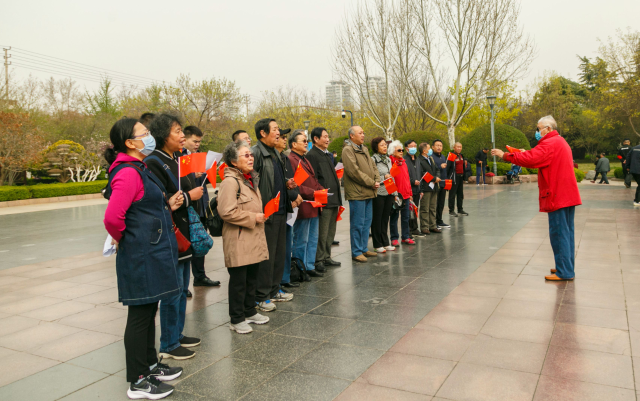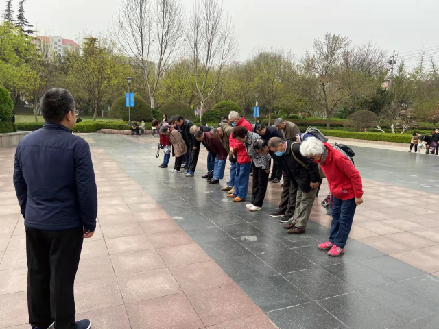 根据活动流程,各位校友代表在毛主席塑像前鞠躬致敬领袖,并合唱《没有共产党就没有新中国》。合唱完毕,校友们举起手中的国旗,迎着春风,在毛主席塑像前合影留念,随后参观济南战役纪念馆和革命烈士陵园。