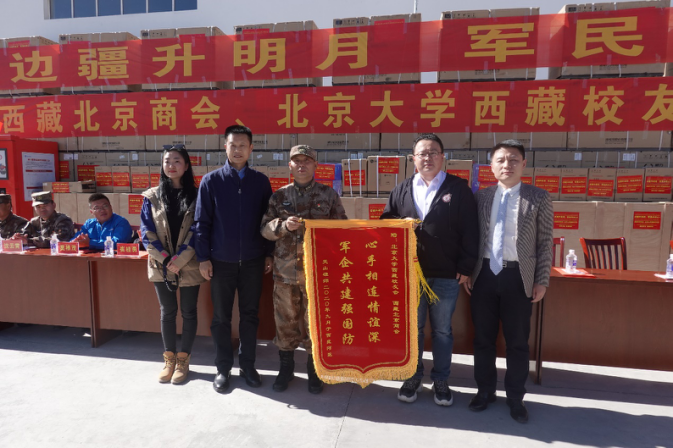戍边陆军某部代表表示:对社会热心人士、企业家们拥军捐赠的善举深表感谢,大家的行为给予前线官兵温暖和鼓励,我们将在今后的工作中,以实际行动不断巩固和发展军民团结的大好局面。为促进边疆稳定和社会长治久安发挥更大的作用,并向西藏自治区北京大学校友会赠送锦旗——“心手相连情谊深、军企共建强国防”。