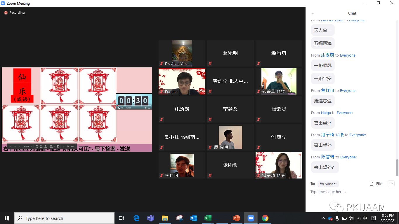 晚会也设有幸运红包抽奖和猜灯谜环节。大家也积极参与其中,场面非常热闹。另外,晚会特设分享环节,现场连线身处中国的马来西亚北大人吴小红和庄雯蔚,分享这一年下来她们所经历的燕园生活和校园变化。“谢谢分享!很久没看到校园了。” “谢谢学姐让我们看到心心念念的北大!”“疫情过去了,我们一起再相聚北大!”,各个留言尽显北大人一心想尽早重返校园的渴望和心愿。
