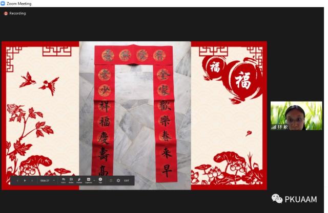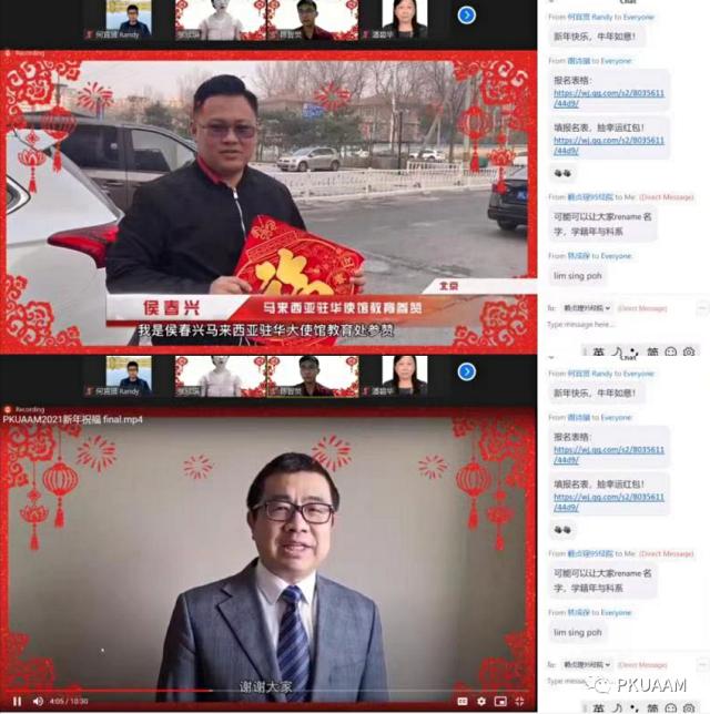 接着,大会播放马来亚北大人新年祝福视频,其中也有幸邀请马来西亚驻华使馆教育参赞侯春兴和北大校友会副会长兼秘书长李文胜老师献上新年贺词。接着,晚会播放李文胜老师在未名湖畔献唱《最亲的人》的表演视频,用歌声把大家带回到燕园。校友何宜贤以及在籍生陈锦雯也分别献上提前录制的新春表演视频,为晚会助兴。