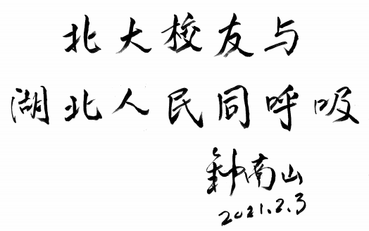 2021年2月3日,北大校友、共和国勋章获得者钟南山院士,应北京大学校友会和湖北省北京大学校友会的请求,亲笔题写“北大校友百万口罩行动”和“北大校友与湖北人民同呼吸”,这两幅题字表达了钟南山校友对北大全球校友在湖北战疫中捐款捐物壮举的赞扬,更代表北大校友、并作为呼吸内科学家,表达了他对湖北人民的坚定支持。