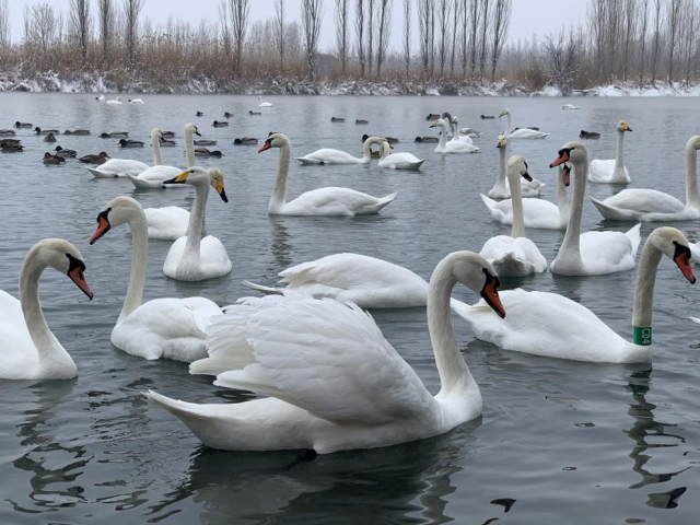 最后,校友们驱车前往“童话世界”——伊宁天鹅泉。天鹅泉是伊宁县英塔木乡夏合勒克村伊犁河北岸一处湿地,后经人工开拓成湖,因为有地下热泉,虽身处千里冰封的天山河谷却不结冰。每到隆冬季节,这里就化为童话仙境,优雅的天鹅游弋在湖面,引颈展翅,翩跹起舞。