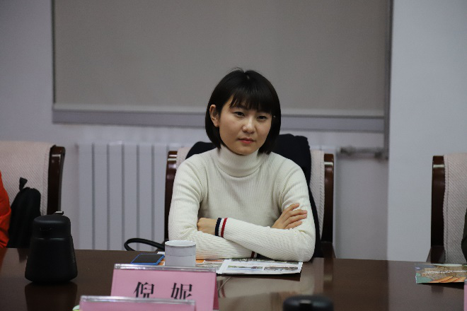 拜文汇校友(左一)介绍山东外国语职业技术大学情况
