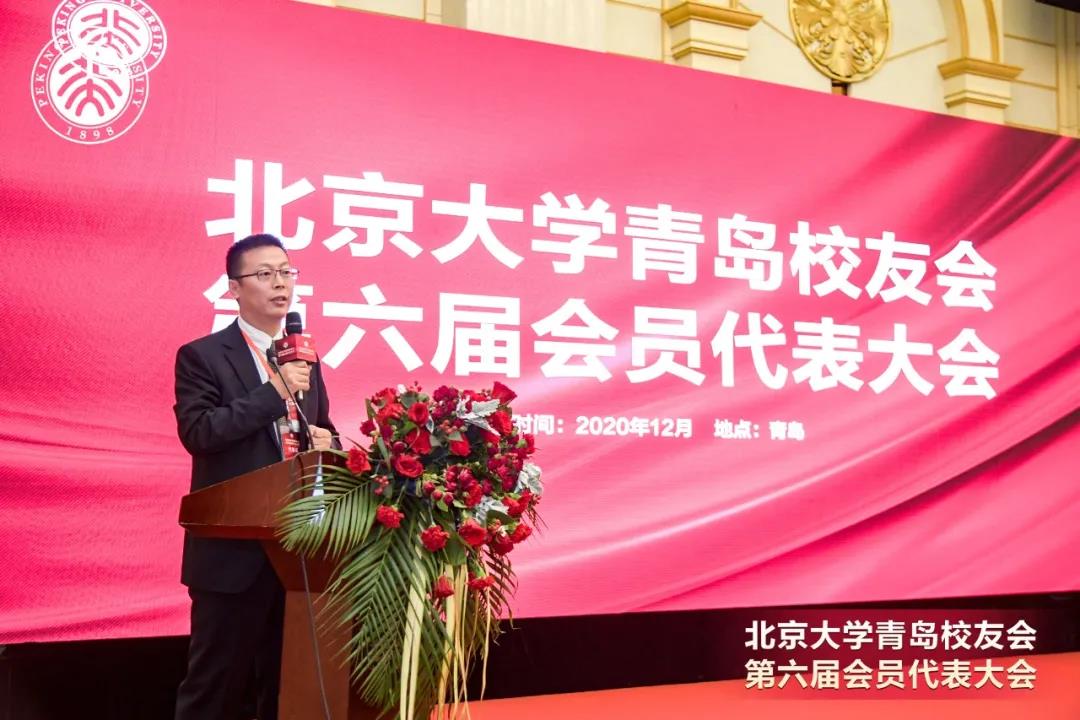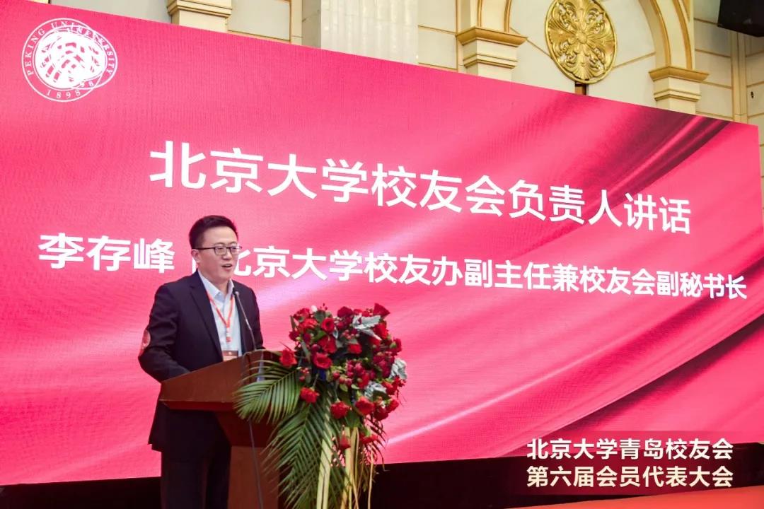 北京大学校友工作办公室副主任李存峰发表讲话。他首先向青岛校友会各位校友致以诚挚的问候,并介绍了北京大学今年以来在学术发展、师资队伍、国际交流与合作等领域取得的发展成果,以及北京大学校友会及各校友组织在今年全球抗疫中所作出的贡献。他代表学校校友工作办公室,衷心祝愿青岛校友会新一届理事会与在青岛的全体北大人一起,继承母校的光荣传统,保持和发扬青岛校友会的优良作风,进一步发挥校友会的作用,深刻推进校友会的团结、有序发展,更好的凝聚校友的人心,为校友自身事业的发展提供后盾支撑,为母校在新时代的双一流建设提供动力支持,从社会组织的层面为当地经济建设和社会发展作出北大人应有的突出贡献。