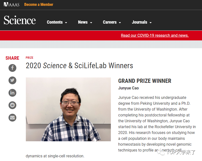 近日,《科学》杂志和SciLifeLab颁发的2020年度青年科学家奖(Science & SciLifeLab Prize for Young Scientists)揭晓,北大校友、美国洛克菲勒大学助理教授曹俊越成为全球唯一特等奖获得者,以表彰其在高通量单细胞测序技术以及发育生物学方面的杰出成就。