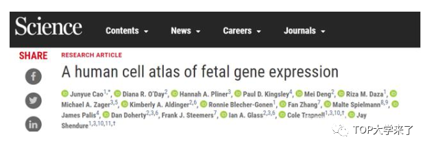 2020年11月13日,华盛顿大学Jay Shendure实验室的曹俊越博士(第一作者)在全球顶级科研刊物《Science》上发表了题为“A human cell atlas of fetal gene expression”的文章,通过研发和优化高通量单细胞测序技术sci-RNA-seq3分析了来自121个人类胎儿器官样本的超过400万个单细胞的基因表达水平。