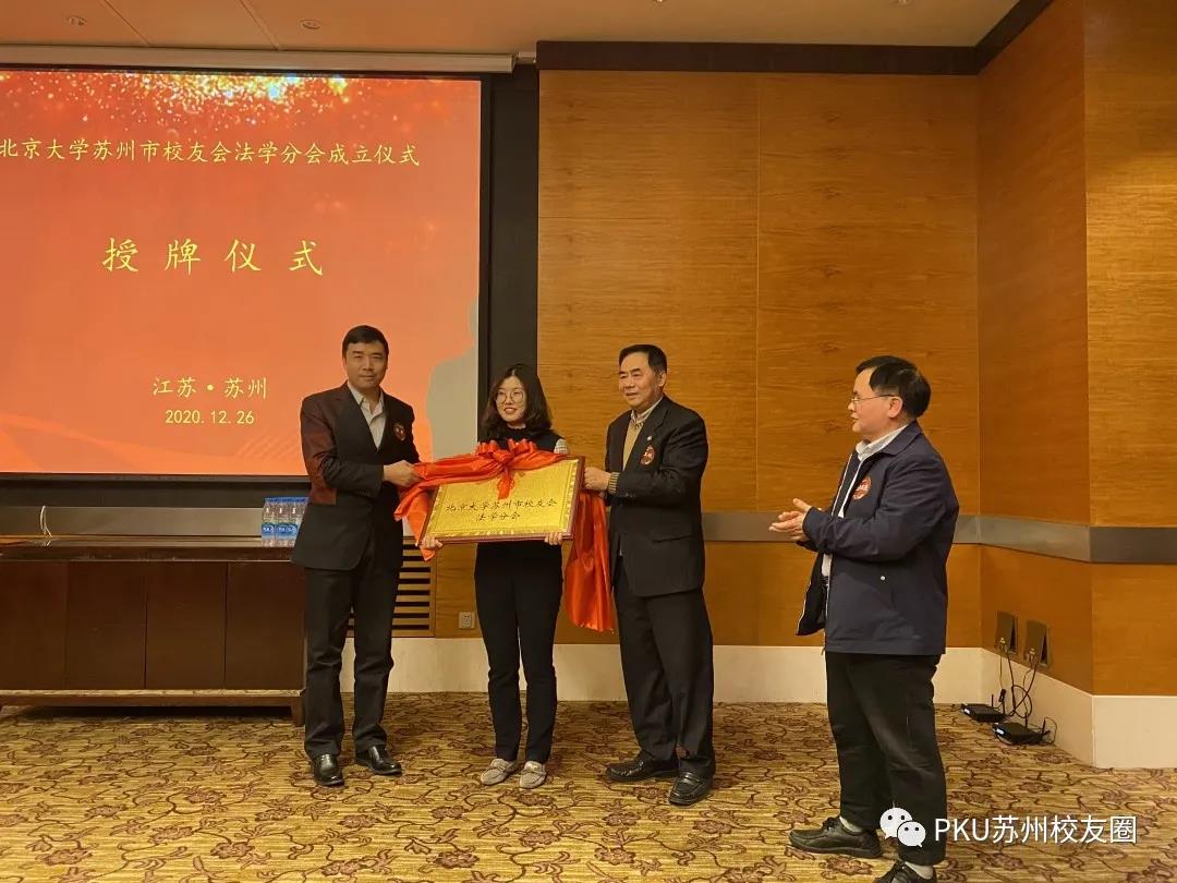 薛军(左一)与副会长(右二)为苏州校友会法学分会授牌