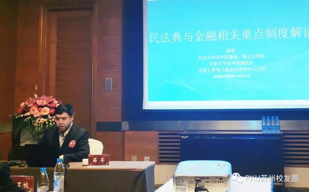 北京大学法学院副院长薛军代表法学院讲话。他对苏州市校友会法学分会的成立表示热烈祝贺,并向校友们介绍了学院近年来的发展情况。他表示,人才培养是北大法学院各项工作的重中之重,校友是法学院大家庭的重要成员,是法学院建设和发展的重要力量。他对广大校友为法学院发展做出的贡献表示感谢,希望校友与学院之间形成紧密共同体,通过法学分会这个平台加强交流,共同服务于地方经济和社会发展建设。