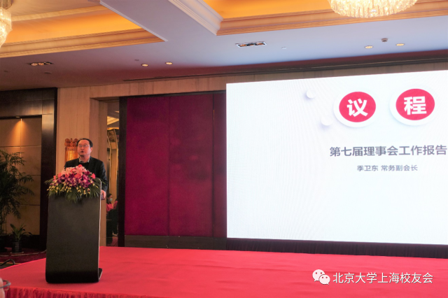 季卫东作第七届理事会工作总结报告,报告中就第七届理事会2016年11月以来的工作从夯实基础、凝聚校友、特色品牌三个方面进行汇报。