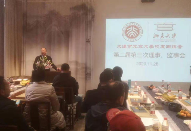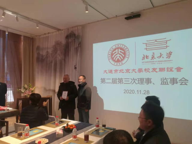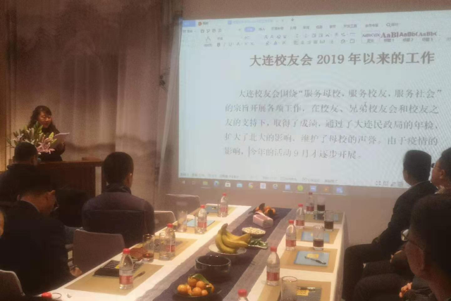 在会议中,秘书长李雪梅对大连校友会2019年以来的工作进行总结:为庆祝五四运动100周年与北大121周年校庆,2019年5月10日校友会组织校友和北大创业训练营营员参观红沿河核电站、恒力石化、长兴岛高尔夫俱乐部、香洲田园城。2020年初疫情爆发,大连校友会联合兄弟校友会和校友之友捐款9万余元,爱丽思欧雅玛公司总经理郭传斌校友分三次组织采购14万余只口罩。校友会根据湖北校友会提供的信息送到湖北最急需的9个地市,余款5万元捐给北大全球抗疫基金。同时,多年来,大连校友会始终协助母校做好招生工作——校友们义务出车接送招生组老师、前来咨询的考生及家长,举办新老校友座谈会,组织新生前往燕园农业大连基地的北大校友林植树。重阳节时,校友会邀请吉大校友会会长宋晓秋为二十多位老校友举办健康讲座,康桥眼科诊所为校友做眼科检查等等。