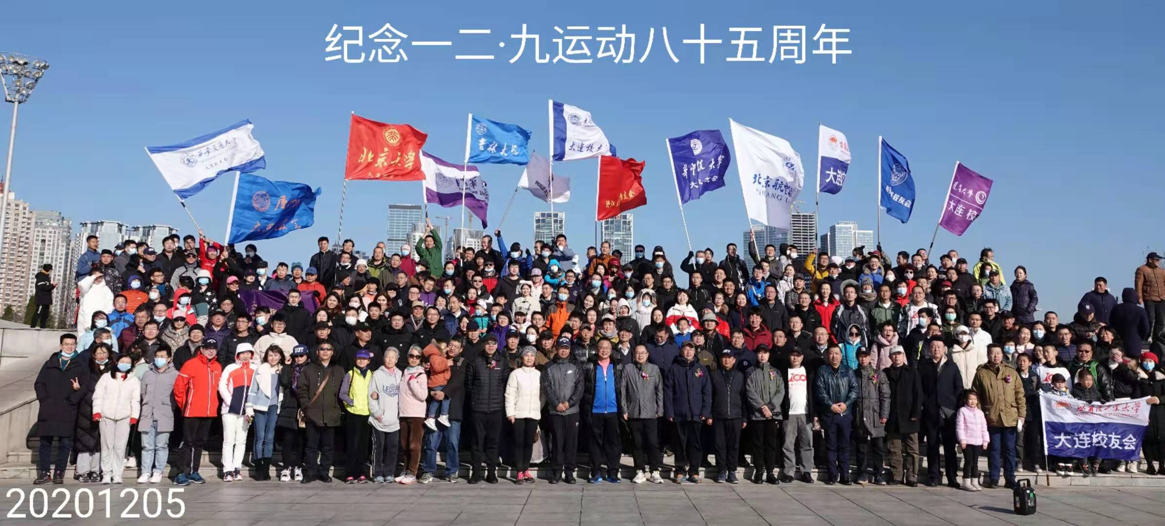 2020年12月5日上午,全国高校在连校友会在星海广场共同组织了以“弘扬爱国精神,携手扬帆起航”为主题的徒步活动,纪念“一二·九”运动85周年。