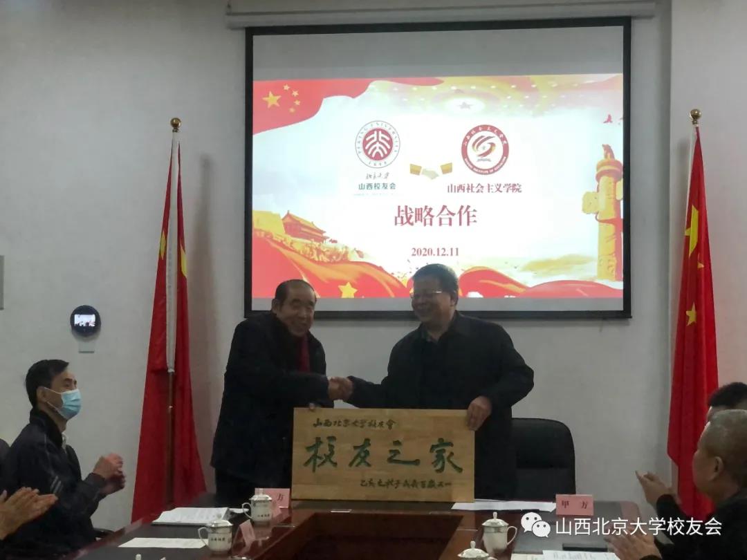 在双方签订战略合作协议后,山西北京大学校友会向山西社会主义学院赠送“校友之家”匾额。
