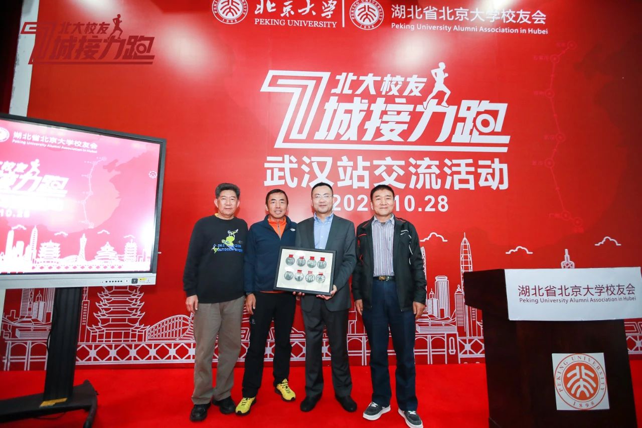 分享会后,曹峻会长代表7城接力跑组委会,向湖北省北京大学校友会赠送7站活动纪念奖牌。刘萌、杨裕利、韩晓光作为校友会代表上台领取了纪念奖牌。午餐时间,校友们仍是交流不断,美食大餐和精神的饕餮盛宴,让每一位到达疫后武汉的北大校友难以忘怀,随着送站大巴车的开动,这美好永远留存在黄鹤白云之地。