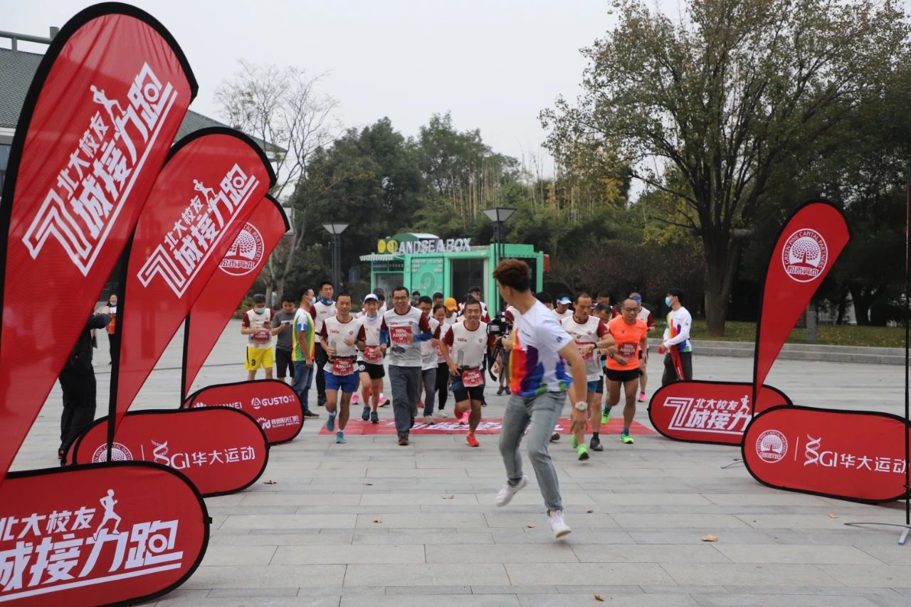 早晨7点的起点处,尽管天气稍显寒冷,校友们豪气不减,身穿红白战衣的北大校友就已经早早地集结完毕了,在教练的带领下开始热身,蓄势待发。随着一声令下,校友们在欢乐和激动中冲出起点,在跑道上尽情驰骋。