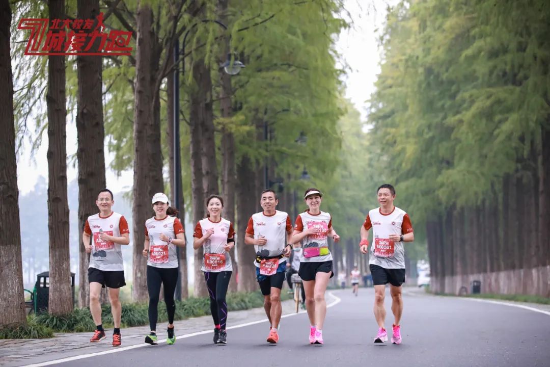 一边欣赏着东湖绿道的沁人风景,一边与志同道合的校友并肩同行,大家精神抖擞,你追我赶地冲向终点,红色运动衫与跑道旁的绿树交相辉映,形成一道迷人的风景线。途中,校友们互相加油鼓劲,跑向更远的里程,凝聚着团结拼搏的精气神。
